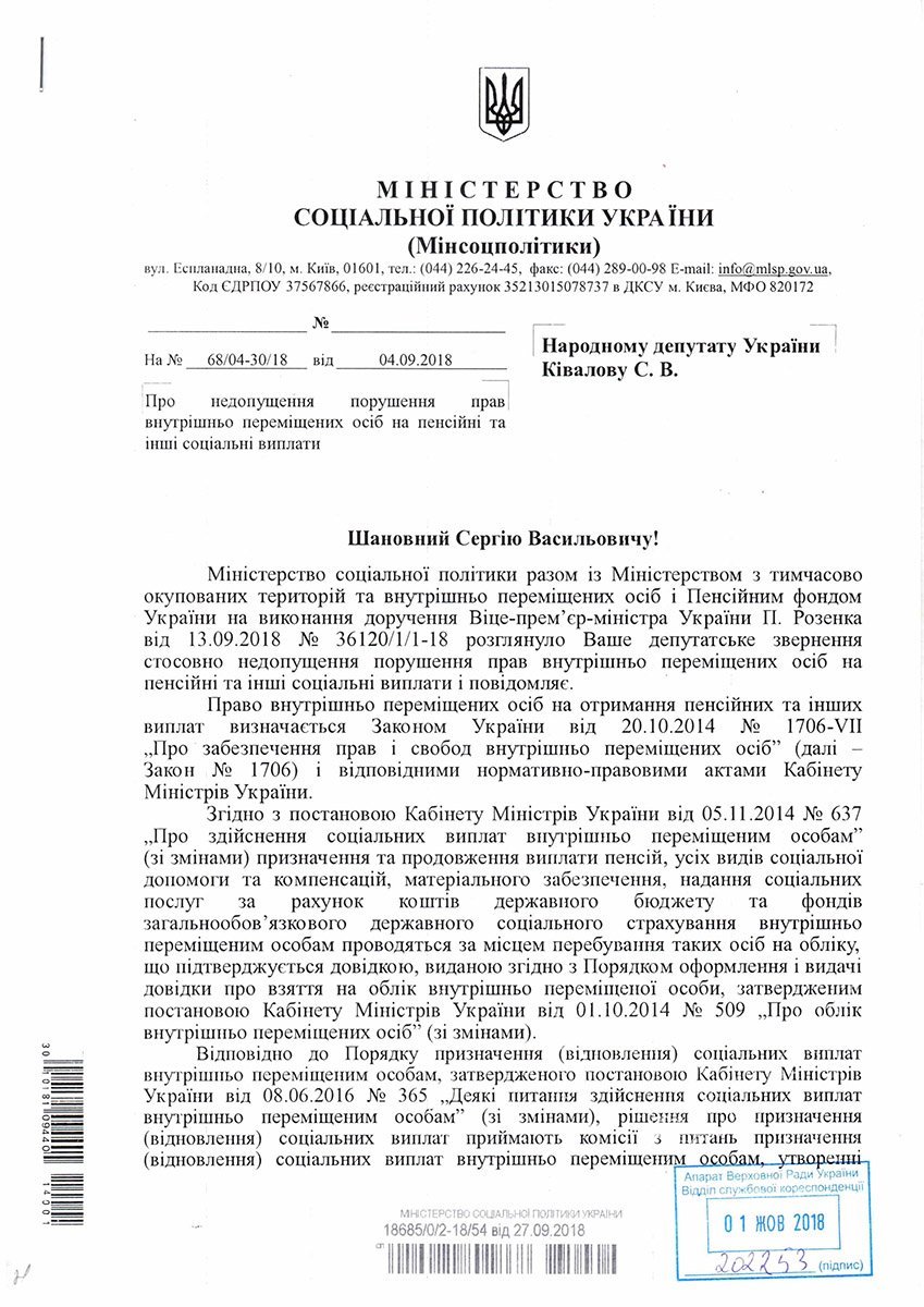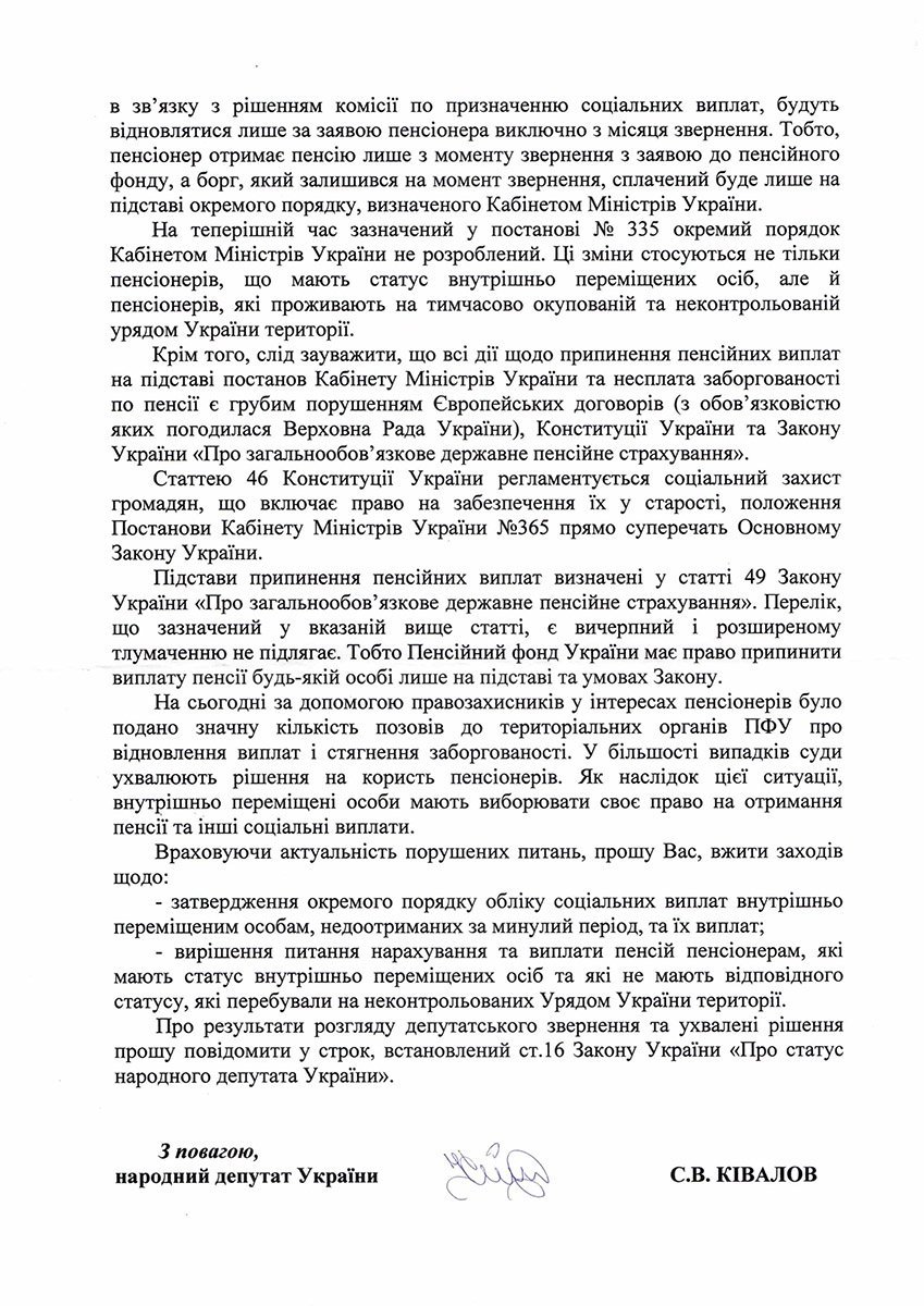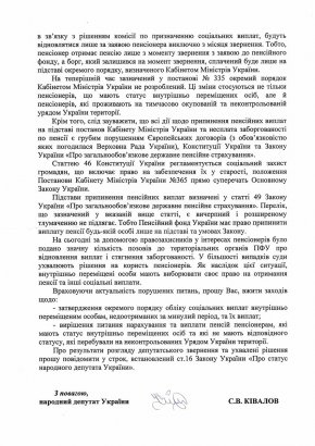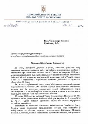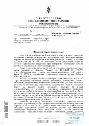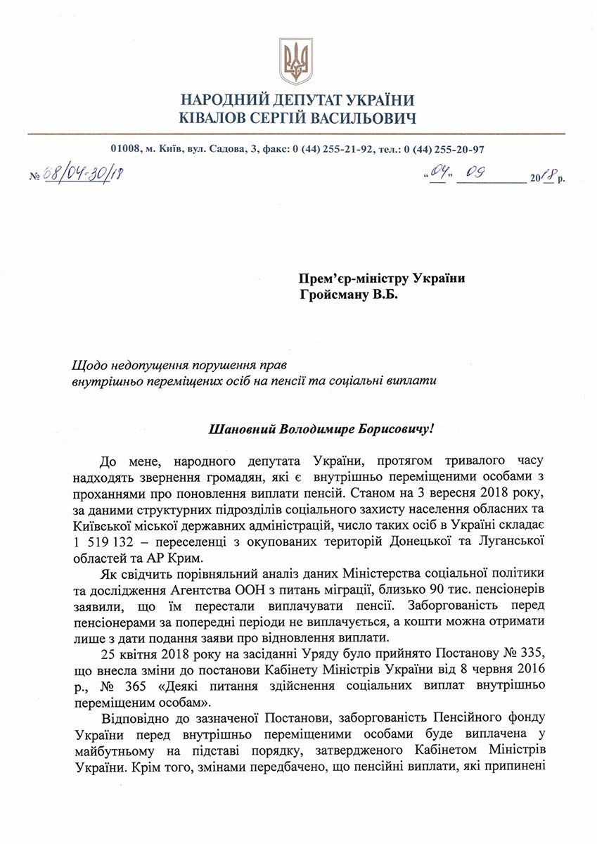 Но есть депутаты, которые последовательно, не на словах, а на деле, объединяют страну, отстаивают интересы всех ее граждан, а не только тех, кто «идеологически правильно мыслит» на данный момент. Именно таким является народный депутат Украины Сергей Кивалов. С самого начала конфликта на Донбассе по его инициативе при Юридической клинике была создана Антикризисная группа по защите прав переселенцев. А сейчас Сергей Васильевич всеми имеющимися у него средствами пытается помочь перемещенным лицам в полном восстановлении их прав, в первую очередь - прав на полноценное получение пенсий и пособий. Так, недавно им был направлен очередной депутатский запрос Премьер-министру Украины Владимиру Гройсману «О недопущении нарушения прав внутренне перемещенных лиц на пенсии и социальных выплатах».