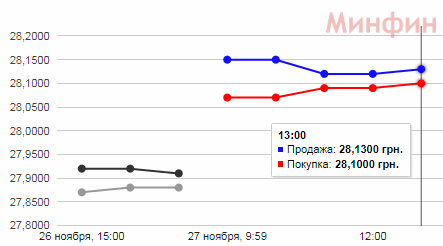 Курс безналичного доллара не находился выше психологической отметки в 28 гривен с начала ноября.
