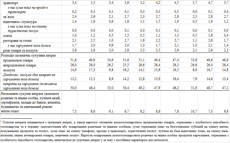 На одежду и обувь украинцы тратят 4,9%, на транспорт – 4,2%, на здравоохранение – 4,1% своего бюджета.