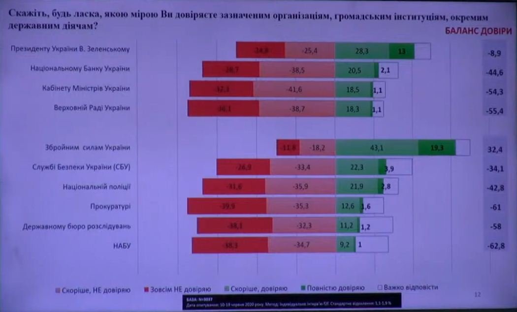 Отрицательный баланс доверия имеют все государственные институты, кроме Вооруженных сил: правительство (-54%), Верховная Рада (-55%), НБУ (-45%), СБУ, Нацполиция, прокуратура, ГБР, НАБУ.