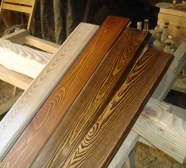 на водной основе - бывает как в готовой форме, так и в порошке для разведения, обычно дает оттенки, близкие к натуральным; при нанесении приподнимает волокна и подвергает древесину большей уязвимости перед влагой;