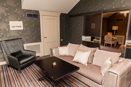 В четырехэтажном здании, выполненном в стиле барокко и являющемся образцом архитектурного наследия Украины, есть 113 номеров. Каждый обставлен итальянской мебелью, изготовленной на заказ. Общая площадь номера зависит от класса и колеблется от 24 до 90 м2.