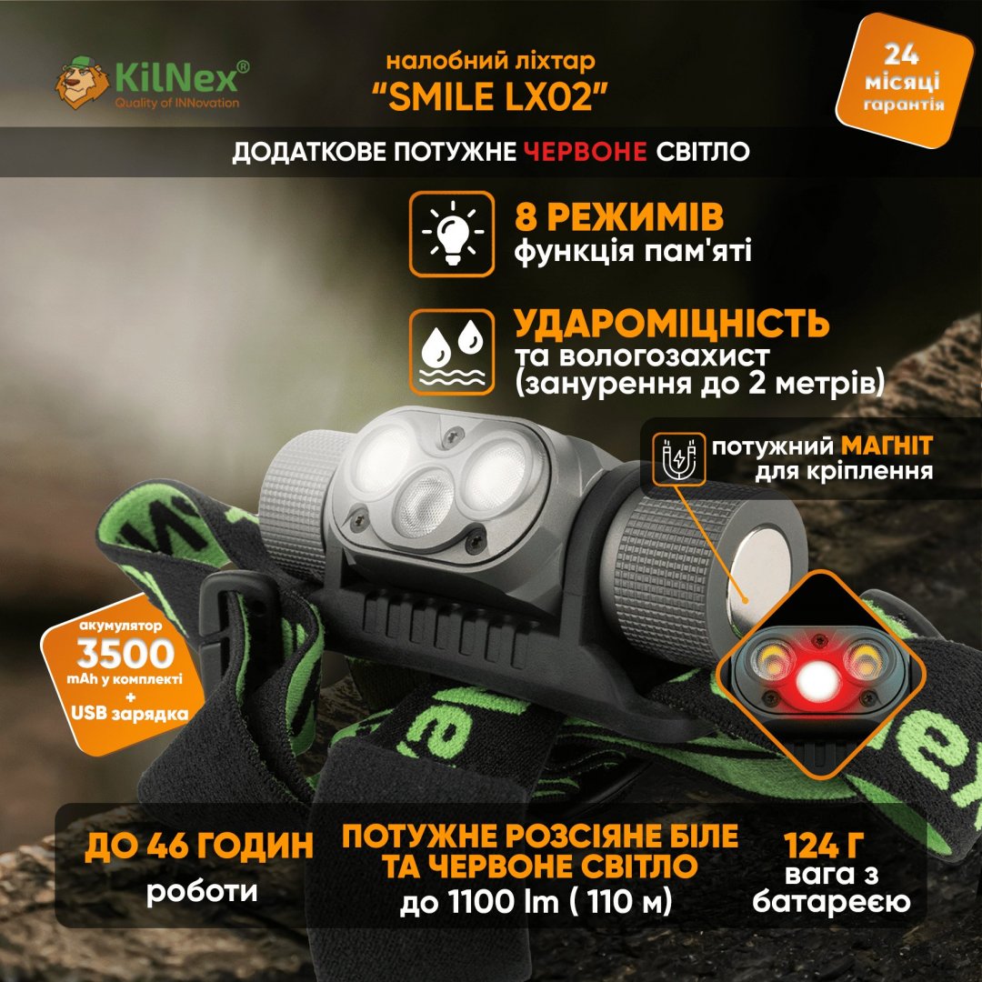 Налобний ліхтар Kilnex Smile LX02 оснащений сучасним світлодіодом CREE XP-G3N, що дає червоне світло потужністю до 140 люменів. Легкий і міцний корпус з алюмінієвого сплаву має анодоване покриття і захист за стандартами IPX8 та MIL-STD-810G. Кут освітлення – 110°, є 4 режими яскравості. У комплекті – акумулятор 18650 на 3500 мАг.