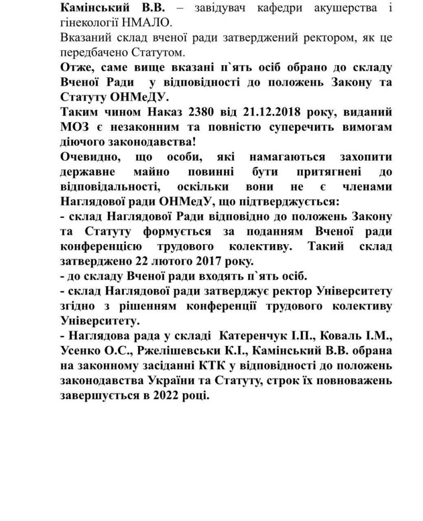 «Таким образом указ №2380 издан МЗУ незаконно и полностью противоречит требованиям действующего законодательства. Очевидно, что личности, которые пытаются захватить государственную собственность, должны быть привлечены к ответственности, поскольку они не являются членами Наблюдательного совета ОНМедУ», — заявили в университете.