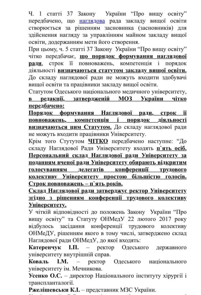 Наблюдательный совет, от имени которого якобы действуют нападавшие, создан указом МЗУ №2380 от 21 декабря 2018 года. Это прямое нарушение законодательства и статута университета. Согласно закону «О высшем образовании» (ч. 1 ст. 37), Наблюдательный совет вуза создается по решению основателя. При этом порядок формирования совета, срок полномочий, компетенции и порядок деятельности определяет статут вуза (ч. 5 ст. 37). Статут Одесского медина в редакции, утвержденной самим же МЗУ, предусматривает: «В состав Наблюдательного совета входят пять человек. Персональный состав Наблюдательного совета университета по представлению ученого совета университета избирают открытым голосованием делегатов конференции трудового коллектива университета простым большинством голосов. Срок полномочий — пять лет. Состав Наблюдательного совета утверждает ректор университета».
