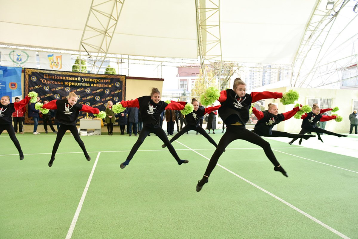 Поздравили участников состязаний самые маленькие черлидеры – группа «Seсret Kids». Своим зажигательным спортивно-музыкальным этюдом девочки воодушевили всех присутствующих, сорвав всеобщие аплодисменты. А студент 3-го курса факультета прокуратуры и следствия Евгений Габрильчук исполнил песню «Красавица Одесса».