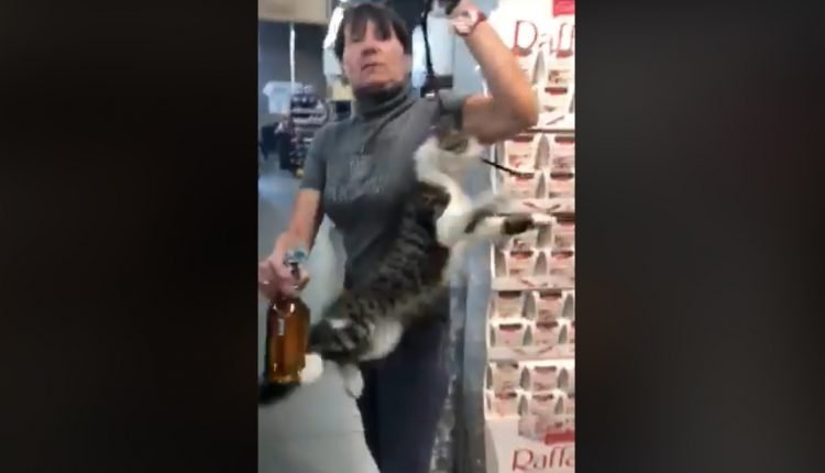 Одесситка опубликовала в соцсетях видео из супермаркета «Копейка» в «Альтаире»: женщина, покупавшая бутылку спиртного, волочила кота на поводке и поднимала его с пола за шею.