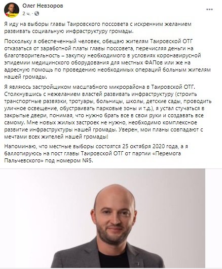 Пока все наперебой говорят о любви к таировцам, Невзоров взял и сделал своим соперникам пакость – пообещал отказаться от будущей заработной платы. «Поскольку я обеспеченный человек, обещаю жителям Таировской ОТГ отказаться от заработной платы главы поссовета, перечисляя деньги на благотворительность – закупку необходимого в условиях коронавирусной эпидемии медицинского оборудования для местных ФАПов или же на адресную помощь по проведению необходимых операций больным жителям нашей громады», - написал на своей страницу в Фейсбук Олег Невзоров.