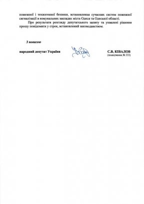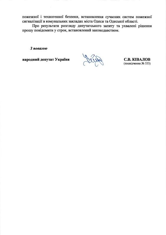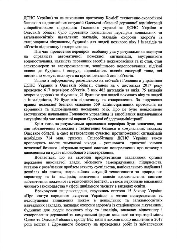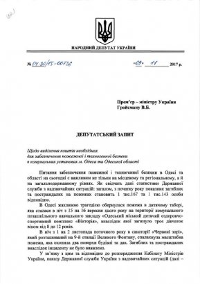 Министерство финансов совместно с Одесской облгосадминистрацией должны просчитать и изыскать необходимые средства на обеспечение учебных, оздоровительных и коммунальных учреждений средствами пожарной и техногенной безопасности. Такое поручение премьер-министр Владимир Гройсман дал своим подчиненным на основании рассмотрения депутатского запроса народного депутат Украины Сергея Кивалова. Напомним, 10 ноября с трибуны Верховной Рады Сергей Кивалов зачитал свое обращение о выделении средств, необходимых для обеспечения учебных, оздоровительных и коммунальных учреждений средствами пожарной и техногенной безопасности Одессы и Одесской области.