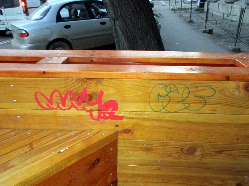 Неподалеку, на углу улиц Бунина и Польской появилась новая беда. Как сообщала наша газета, здесь установлена зона отдыха — первый и пока единственный в Одессе парклет — удобный, где можно присесть, где даже высажена пока нетронутая туя. Здесь же установлена и урна. Вроде, все продумано: и машины теперь здесь не паркуются, и присесть можно. Кстати, проект этот общественный, деньги на него одесситы собирали «всем миром». На нем и надпись имеется «Жителям города — от жителей города».