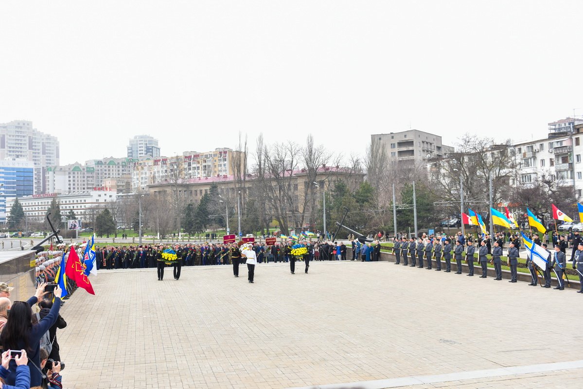 Торжественное возложение венков состоялось и на площади 10 апреля к стеле «Крылья Победы». Там присутствовали руководство города, области, народные депутаты Украины. В этом году на церемонию возложения венков пришло гораздо больше людей, чем в прошлом.