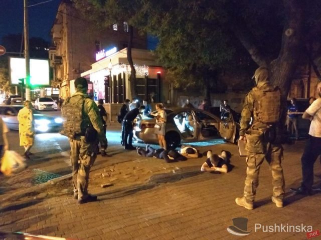 В центре Одессы силовики проводят спецоперацию. Как сообщает корреспондент «Пушкинской», на углу Лейтенанта Шмидта и Большой Арнаутской стоит автомобиль «Toyota Camry» иностранной регистрации с выбитыми передними стёклами и повреждённым задним левым стеклом. Возле иномарки на тротуаре лицом вниз лежат четверо задержанных, на вид – мужчины молодого возраста.