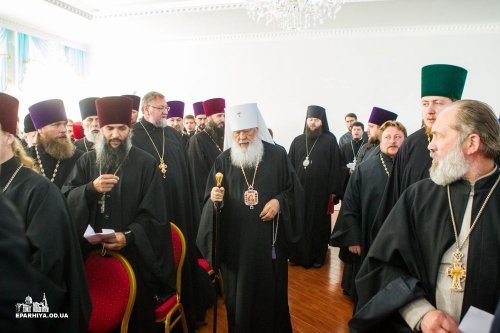 Затем с напутственным словом к собравшимся обратился Высокопреосвященнейший митрополит Агафангел, который призвал всех к открытому доверительному разговору о проблемах, связанных с анонсированным получением тк называемых Томоса и автокефалии в Украине. Владыка напомнил священнослужителям об ответственности перед Христом и историей и призвал всех священнослужителей оставаться верным своей священнической присяге.