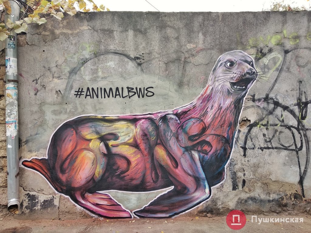 Старую обшарпанную стену украсило изображение игривого морского котика. Мурал еще совсем «свежий» - даже краска не успела высохнуть.
