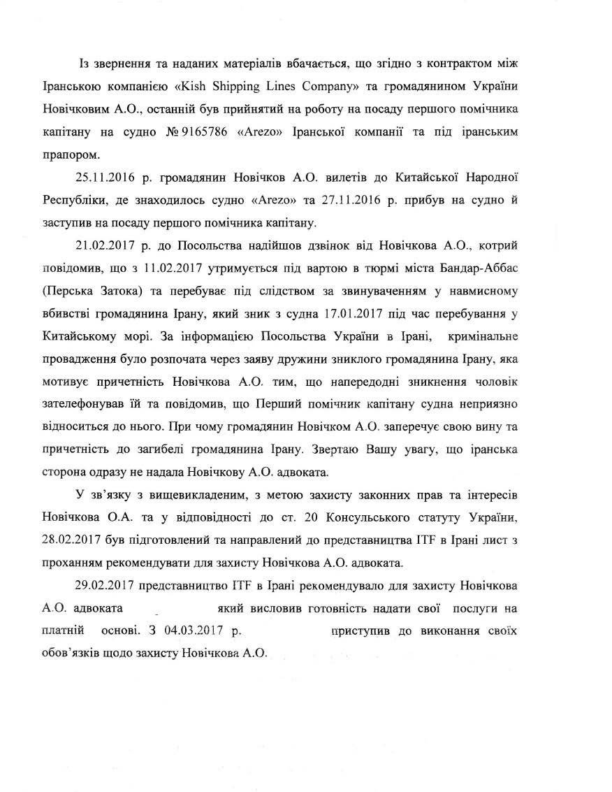 Буквально сразу же после звонка внука, Елене Николаевне позвонил второй секретарь посольства Украины в Иране Виталий Заянчковский. Он подтвердил, что Андрей Новичков арестован и ему выдвигают подобные обвинения. А дальше сообщил, что Андрею выделили государственного защитника на суде, но он, по словам дипломата, никак не отстоит интересы украинца в Иране. Секретарь МИДа посоветовал бабушке моряка нанять частного адвоката. Через неделю посольство порекомендовало конкретного человека. Ему нужно было заплатить 7000 долларов. Что и было сделано. Но ощутимых результатов не принесло.