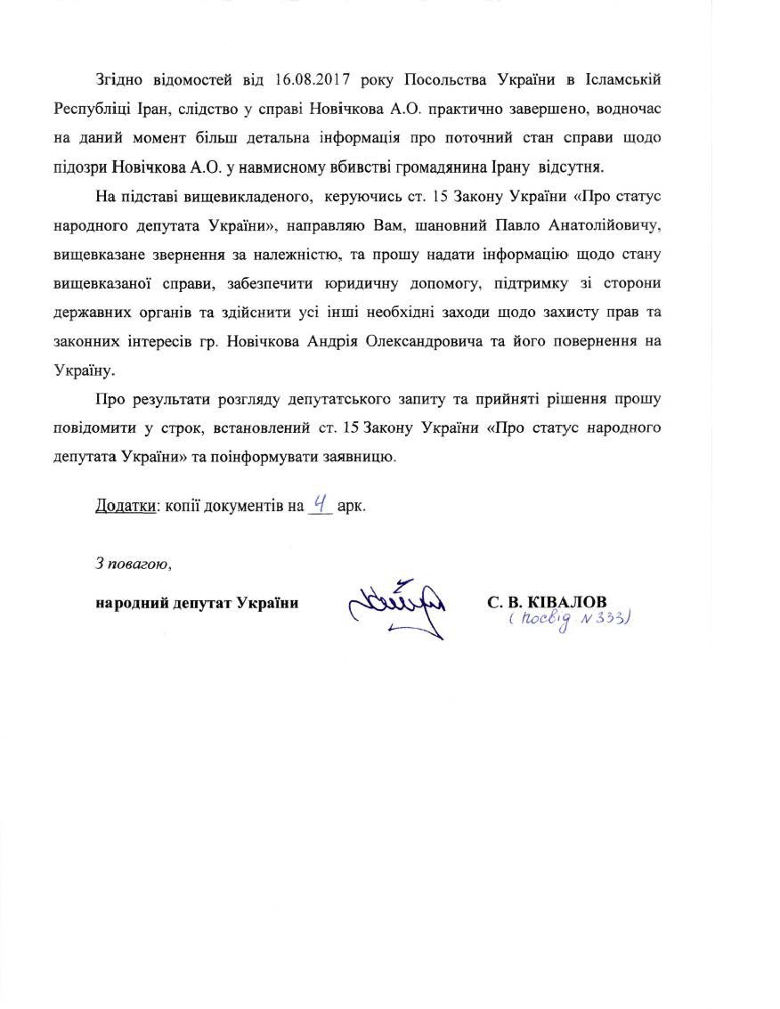 В конце октября народный депутат встретился с Президентом Украины, который обещал поспособствовать возвращению домой нашего соотечественника. Как результат, Петр Порошенко подписал указ о помиловании иранца Али Джадуеля. Теперь стал возможен равноценный обмен украинца на гражданина Ирана.