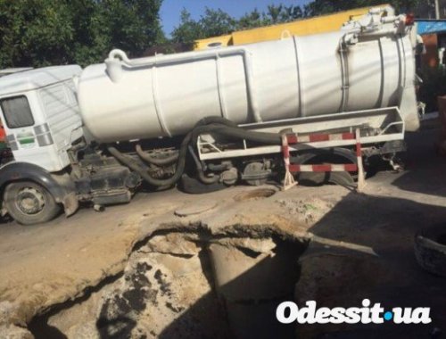 Грузовик с цистерной провалился под асфальт в районе Аркадии. Об этом сообщают очевидцы в соцсетях.