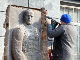 Барельеф снесли представители общественных организаций, мотивируя свои действия необходимостью декоммунизации. Областное управление архитектуры составило акт по факту незаконного сноса.