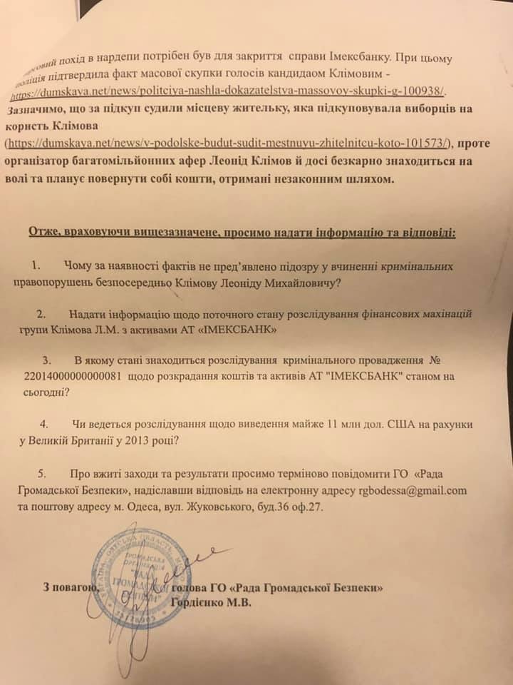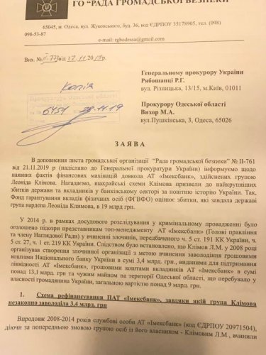 В частности, представители общественной организации «Рада Громадської Безпеки» обратились в прокуратуру Одесской области с официальным заявлением, в котором подробно изложили схемы вывода за границу денег вкладчиков АО «Имэксбанк». По заявлению общественников, только на схеме так называемого рефинансирования банка группа Климова завладела 3,4 млрд грн. обманутых вкладчиков банка. Вообще же преступная деятельность Леонида Климова, как основного держателя акций «Имэксбанка» и его ближнего круга нанесла государству ущерб на сумму 19 млрд грн. Эти данные официально озвучены Фондом гарантирования вкладов физических лиц.