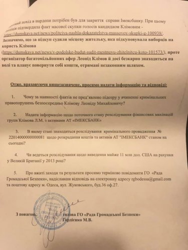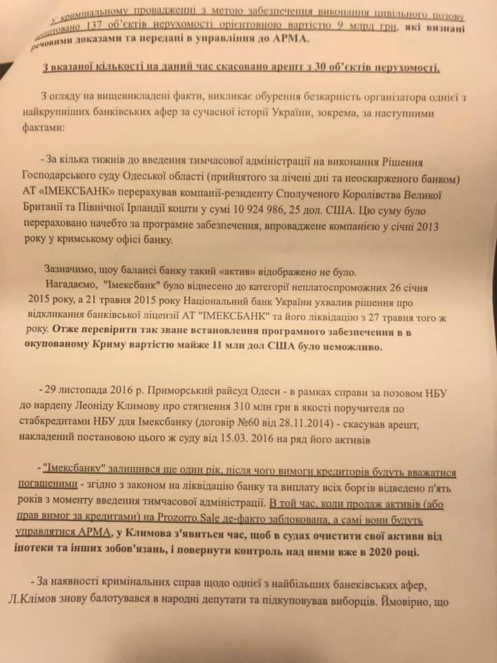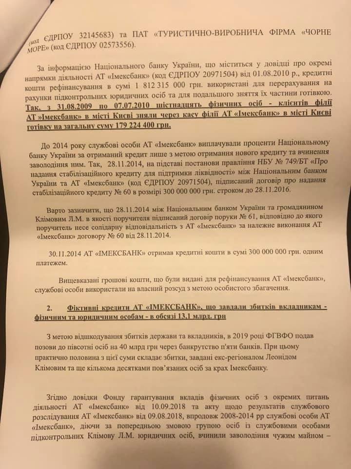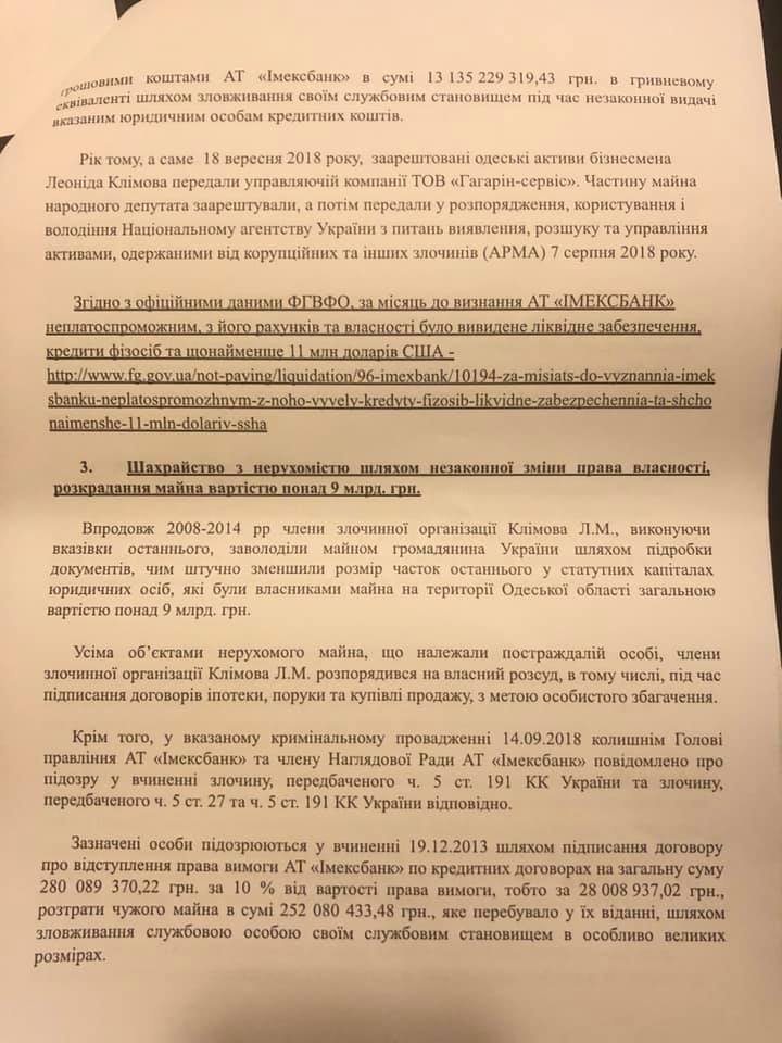 Также в официальном обращении на имя прокурора Одесской области говорится о других схемах Леонида Климова. К примеру, на выдаче липовых кредитов, а также сомнительном строительстве. 9 млрд грн, по данным официальных источников, Климов получил от сделок с имуществом, путем незаконной смены собственности.