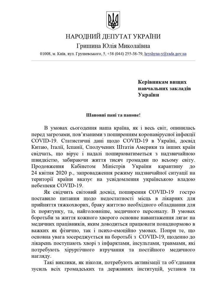Во-вторых, это привлечение студентов-волонтеров. Учитывая, что во время пандемии в помощи нуждается уязвимая категория населения, люди пожилого возраста, должны максимально ограничить контакты, а также не могут выходить за лекарствами, продуктами по состоянию здоровья, важно создать волонтерское студенческое движение. Студенты 3-5 курсов любого учреждения высшего образования могут привлекаться как волонтеры для поддержки социально уязвимой категории граждан, чем также существенно будут способствовать ограничению распространения COVID-19», - обращается к ректорам украинских вузов Юлия Гришина.