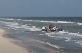 У Лебедевской косы на берег выбросило буксир с буровой платформой.