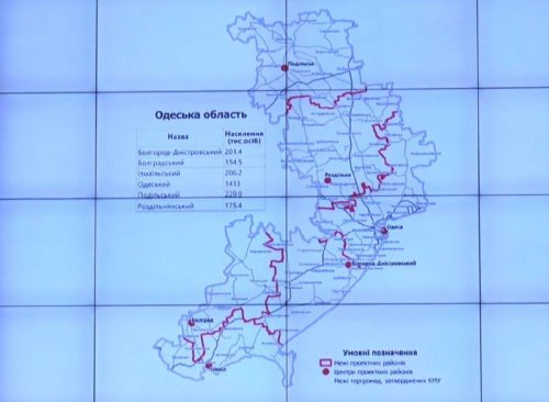 В Одесской области облгосадминистрация предлагала создать пять районов: Измаильский, Арцизский, Белгород-Днестровский, Одесский, Подольский. Эксперты же предлагали варианты или на четыре района - без Арцизскому, или на пять районов в другой конфигурации без Арцизского но с Раздельнянским.