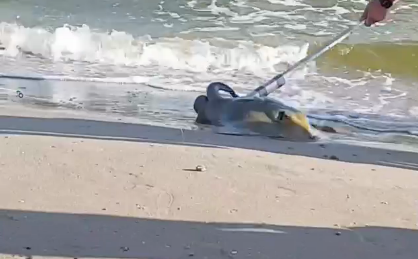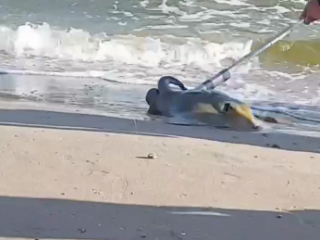 Электрического ската выловили на пляже в курортном поселке Затока в понедельник, 21 сентября. Очевидцы происходящего отметили, что несколько человек пытались вытащить экзотическое животное на берег. Мужчины с удочками и подсаками подцепляли ската и оттаскивали подальше от воды. Рыба долго сопротивлялась.