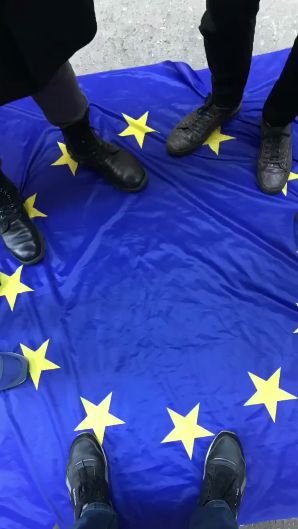 Видео, на котором молодые люди срывают флаг ЕС и топчутся по нему, было обнаружено во время мониторинга сети Интернет.