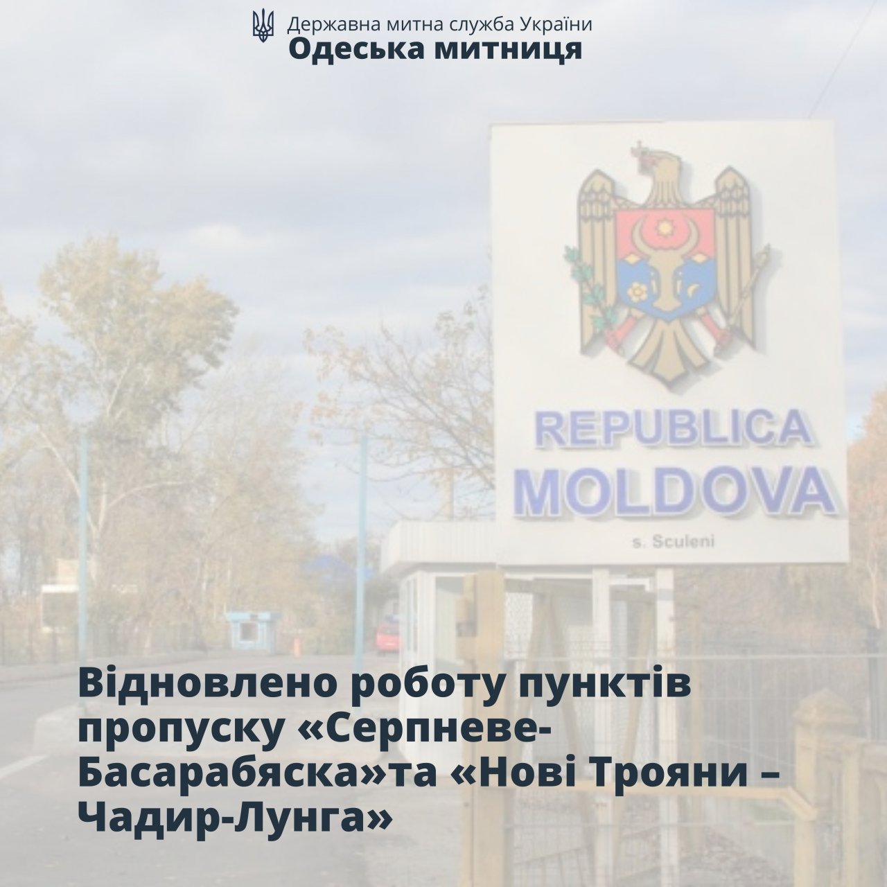 С сегодняшнего дня восстановлены пропускные операции еще в двух пунктах пропуска на украинско-молдавской границе - «Серпневое-Басарабяска» и «Новые Трояны - Чадыр-Лунга».