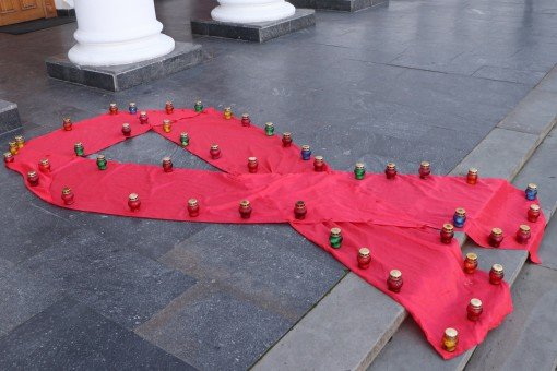 На ступеньках одесской мэрии развернули большую красную ленту – символ борьбы со СПИДом, а также зажгли свечи в знак памяти умерших от СПИДа.