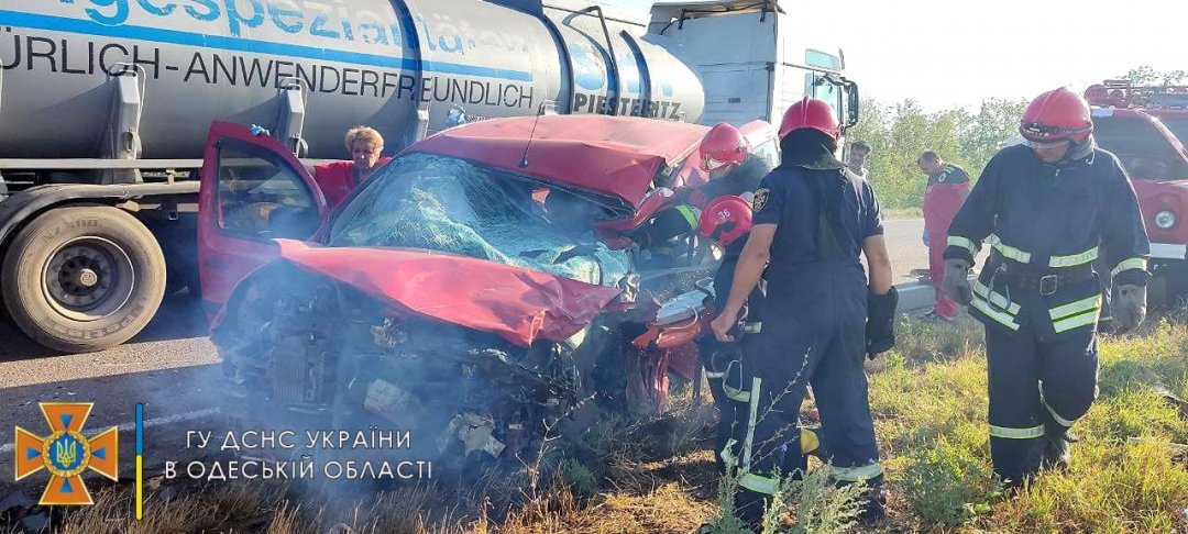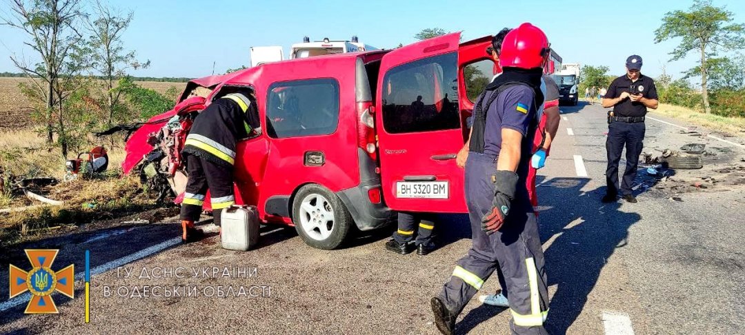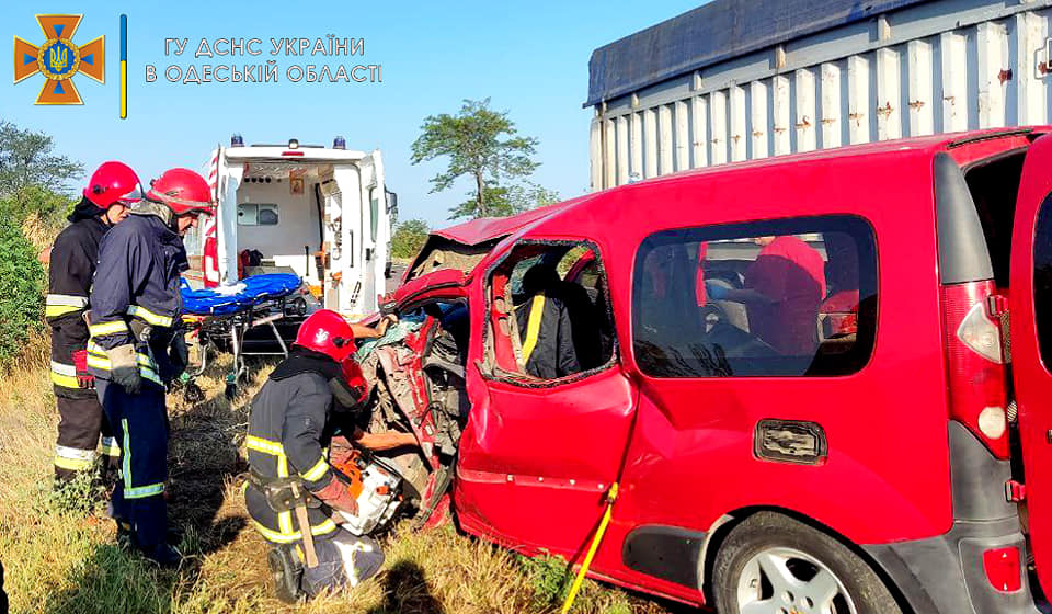 По предварительной информации, водитель Renault Kangoo отвлекся на что-то и, не справившись с управлением, врезался в зерновоз с прицепом, который двигался по встречной полосе в направлении Измаила.