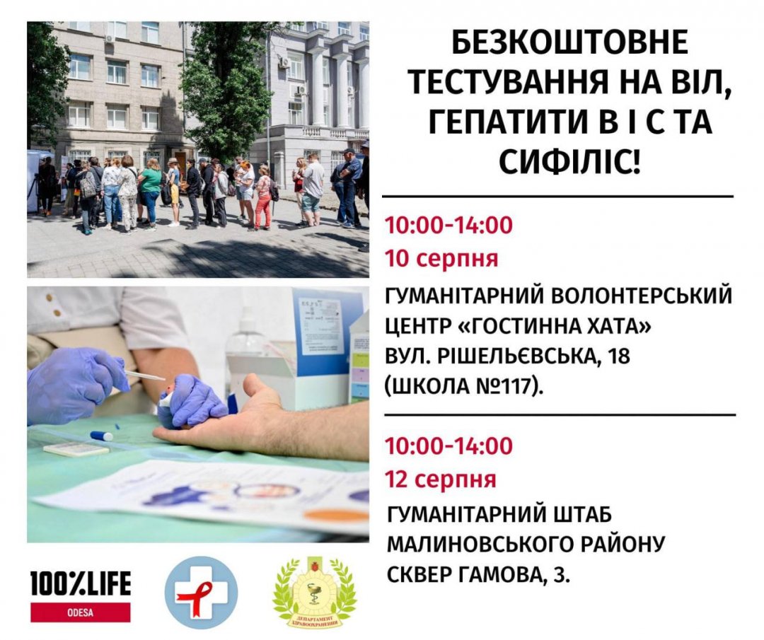 10 и 12 августа в Одессе для всех желающих проведут бесплатное тестирование на ВИЧ, гепатиты В и С. Данную акцию организуют Одесский городской центр профилактики и борьбы с ВИЧ/СПИДом совместно с БО «100 процентов жизни. Одесса».