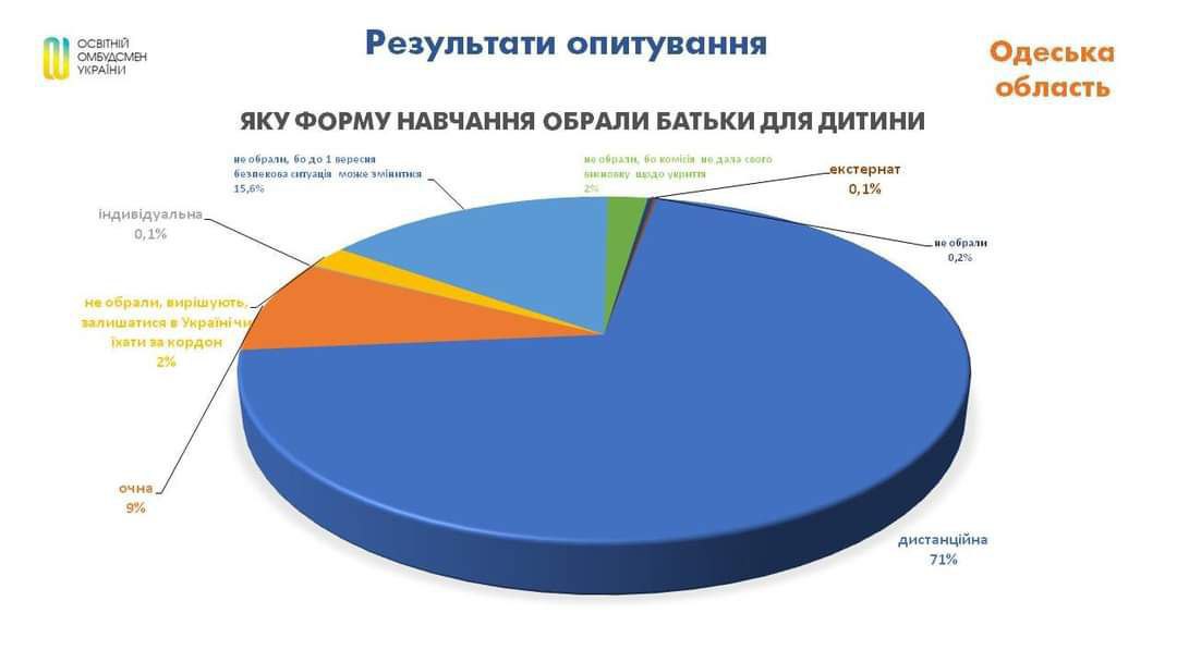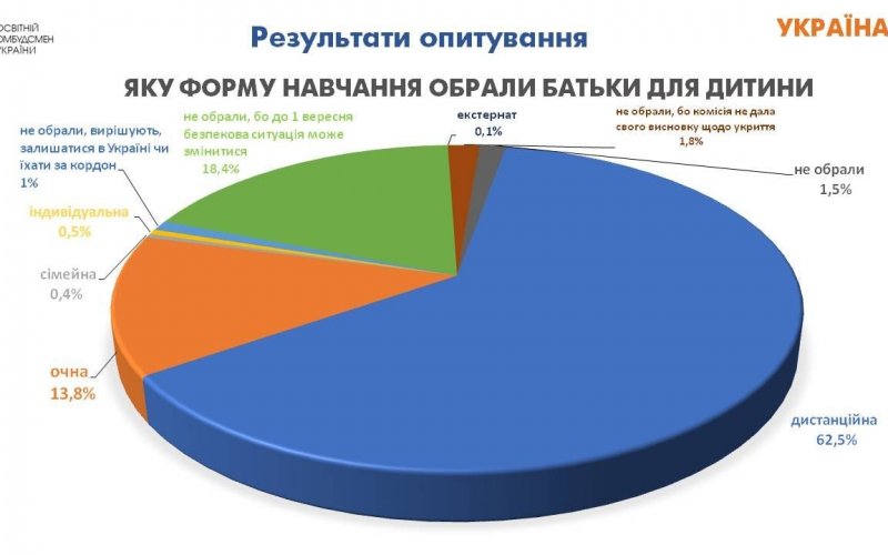 По итогам анкетирования 62,5% украинских родителей выбрали дистанционку для своих детей, 13,8% – очное обучение в учебном заведении. При этом 18,4% родителей еще не знают, какую форму обучения выбрать, поскольку до 1 сентября ситуация с безопасностью может измениться.