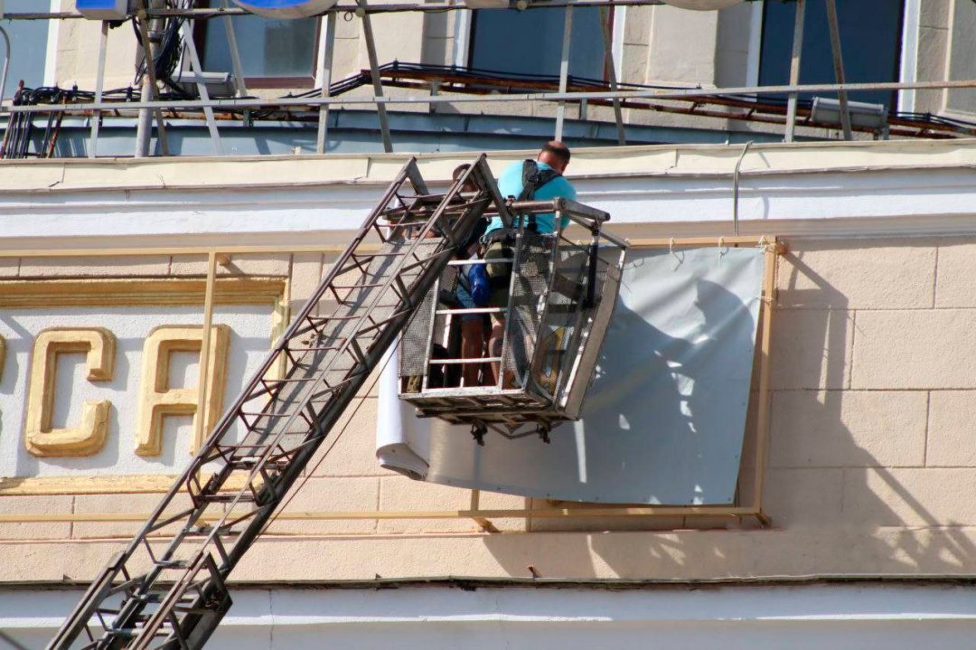 С фасада вокзала все же решили убрать советские символы или их часть. Символику на ЖД решили не демонтировать, а прикрыли плакатом.