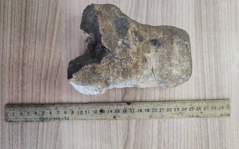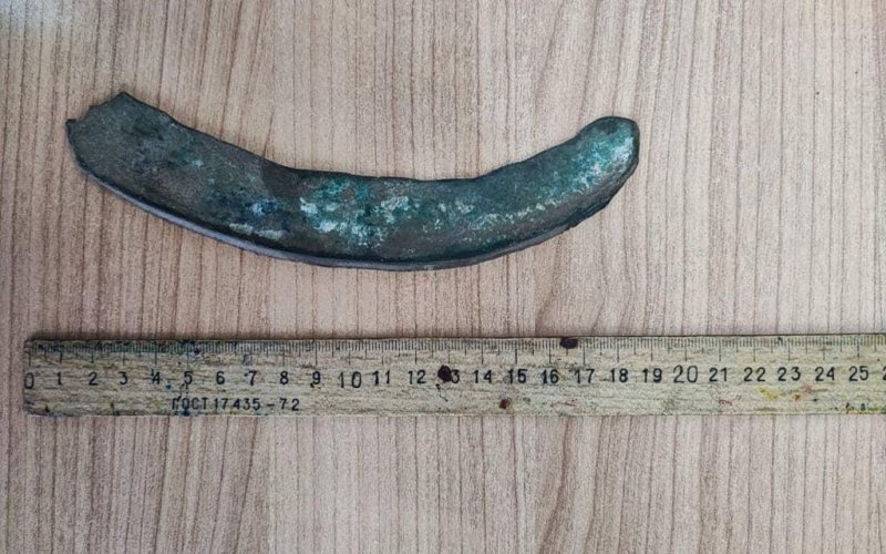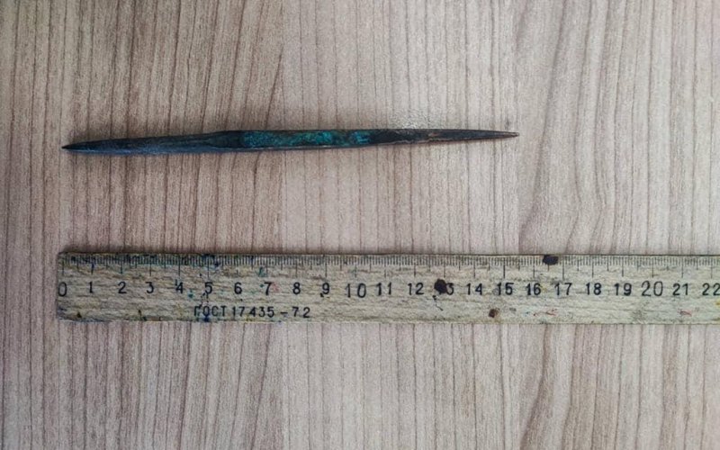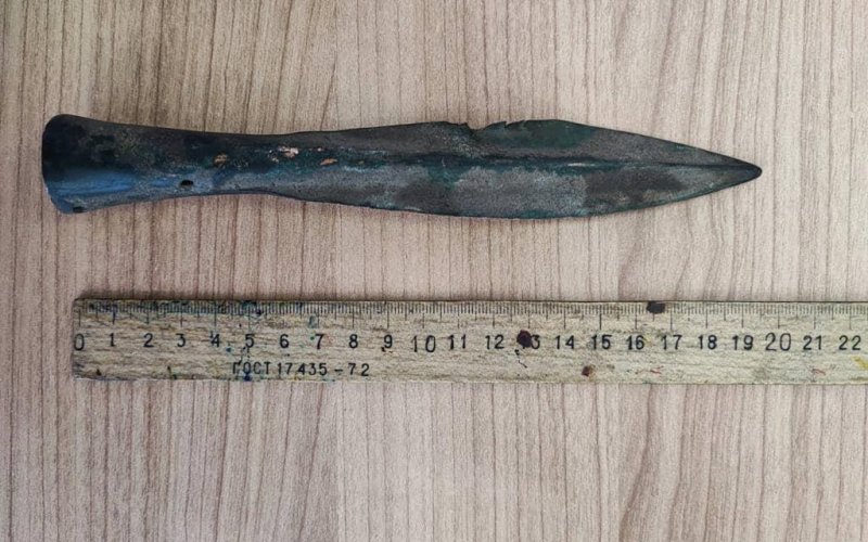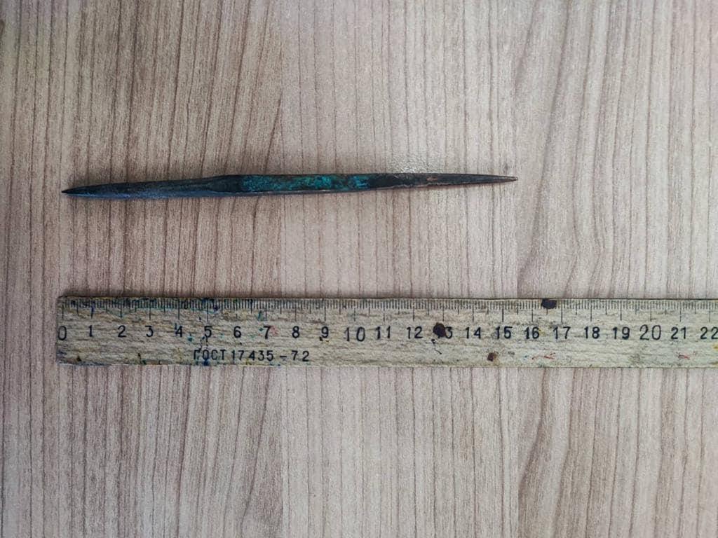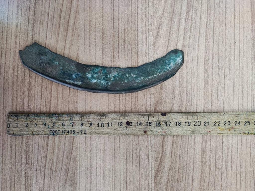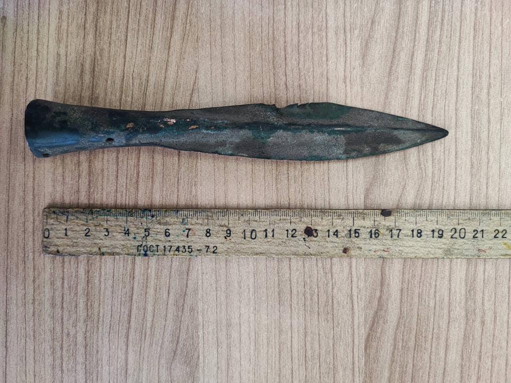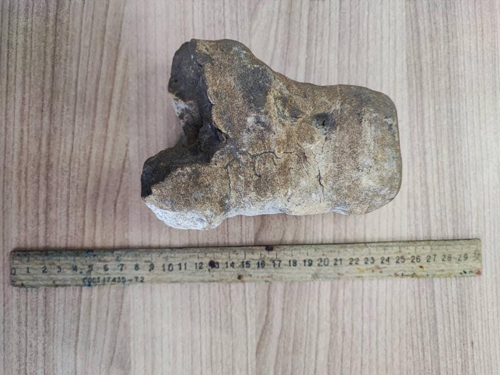 Внешне похожие на шило, наконечник копья и фрагмент серпа предметы были завернуты в прозрачный полиэтиленовый пакет и скрыты среди других инструментов. Рядом с пакетом находился окаменевший предмет темно-желтого цвета, – рассказали таможенники.