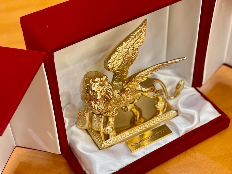 Мэр также продемонстрировал фигуру крылатого льва — символа Венеции, подаренную ему в честь подписания договора.