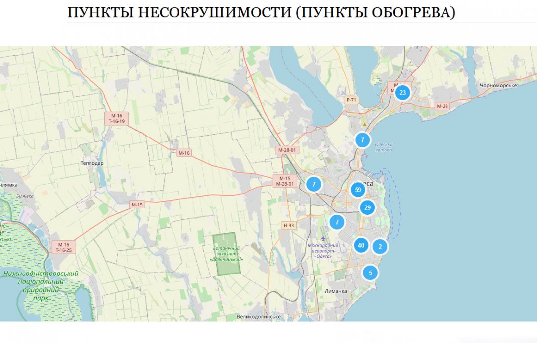 Также в Одессе создали муниципальную интерактивную онлайн-карту Пунктов несокрушимости. Она постоянно дополняется фото и подробной информацией (название объекта, адрес, количество мест, наличие генератора/обогревателя/интернета/возможность подзарядки устройств). В настоящее время карта работает онлайн в режиме тестирования. Планируется, что впоследствии будет и возможность ее использования в офлайн-режиме, добавили в мэрии.