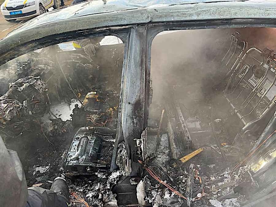 Однако "электрички" горят крайне интенсивно: по фото видно, что машина выгорела полностью, восстанавливать нечего. Чтоы окончательно побороть огонь горящих аккумуляторов, спасателям понадобилось еще 20 минут.
