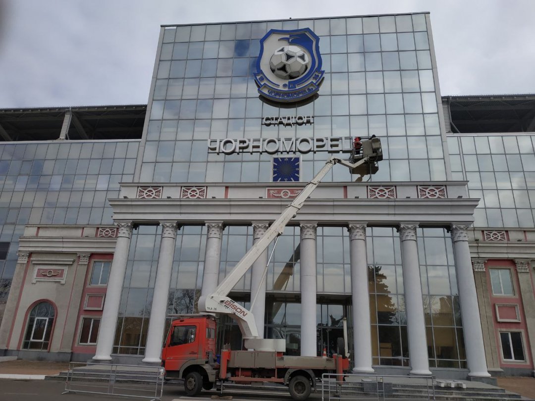 В четверг, 16 февраля, в Одессе на стадионе «Черноморец» проводят работы по смене названия — с русского на украинский: с помощью техники рабочие меняют буквы на фасаде здания.