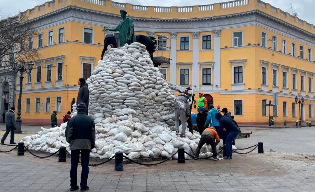 Чтобы защитить памятник Дюку де Ришелье во время войны, одесситы дважды облагали его мешками с песком.