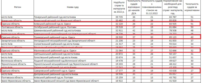 Другие суды Одессы не попали в первую десятку. Малиновский районный суд города Одессы занял 11 место, Суворовский районный суд Одессы - 17 место.