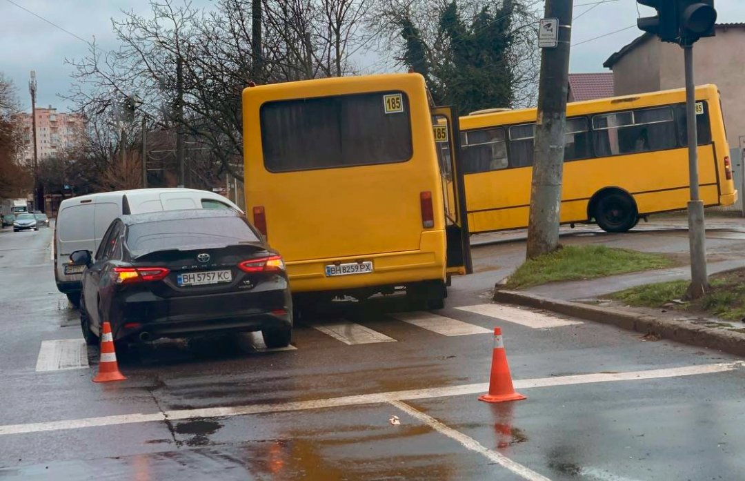 Днем 28 марта на Архитекторской улице в Одессе произошла авария с участием легкового автомобиля Toyota и маршрутки №145.