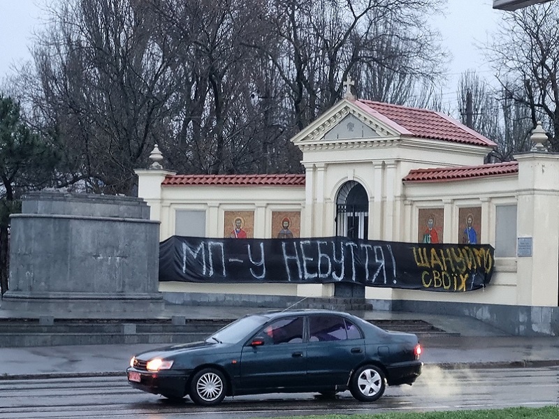 Как отмечают очевидцы, на стене с еще оставшимися иконами висит черный баннер с надписью "мп - в небытие! чтим своих!".