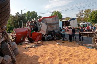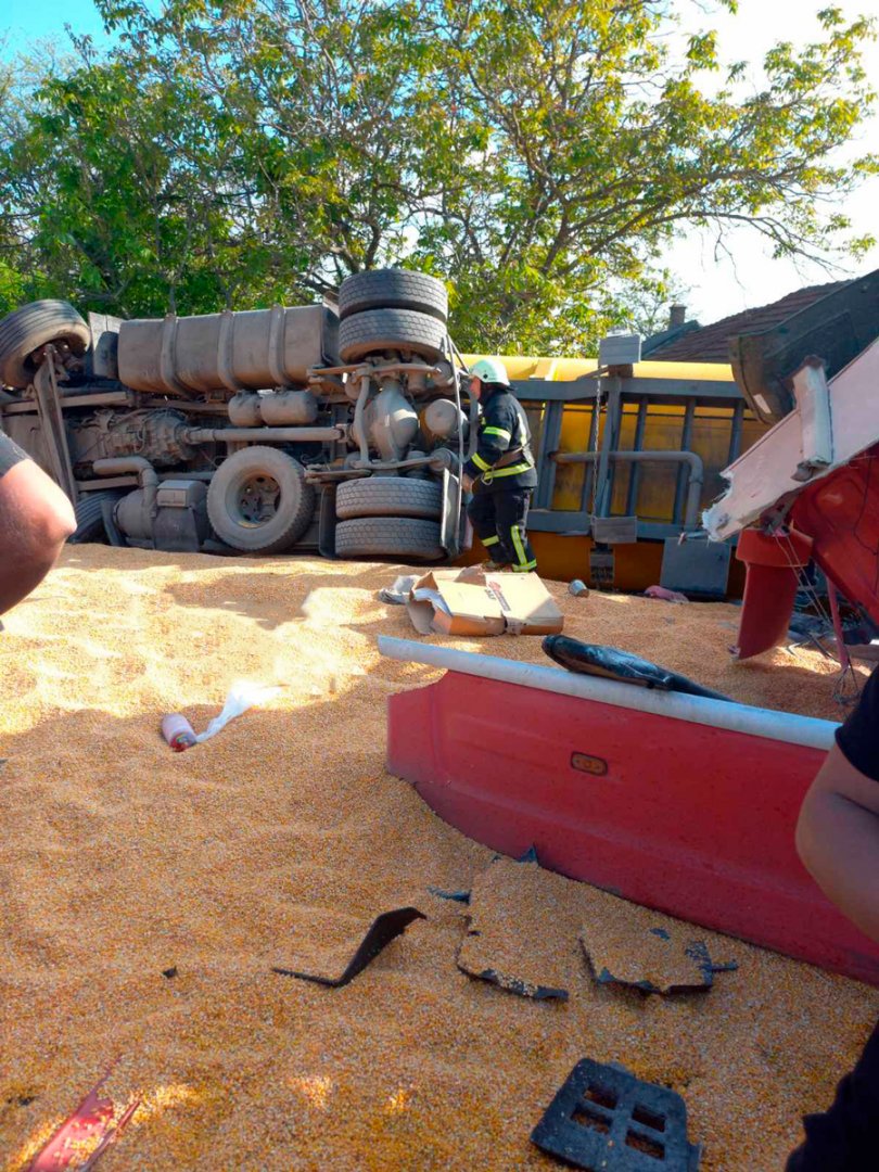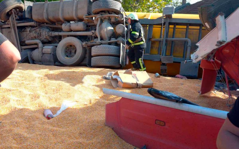 В результате аварии одна из фур опрокинулась. По предварительным данным, есть пострадавшие. Кроме того, на проезжую часть рассыпалось несколько тонн зерна.