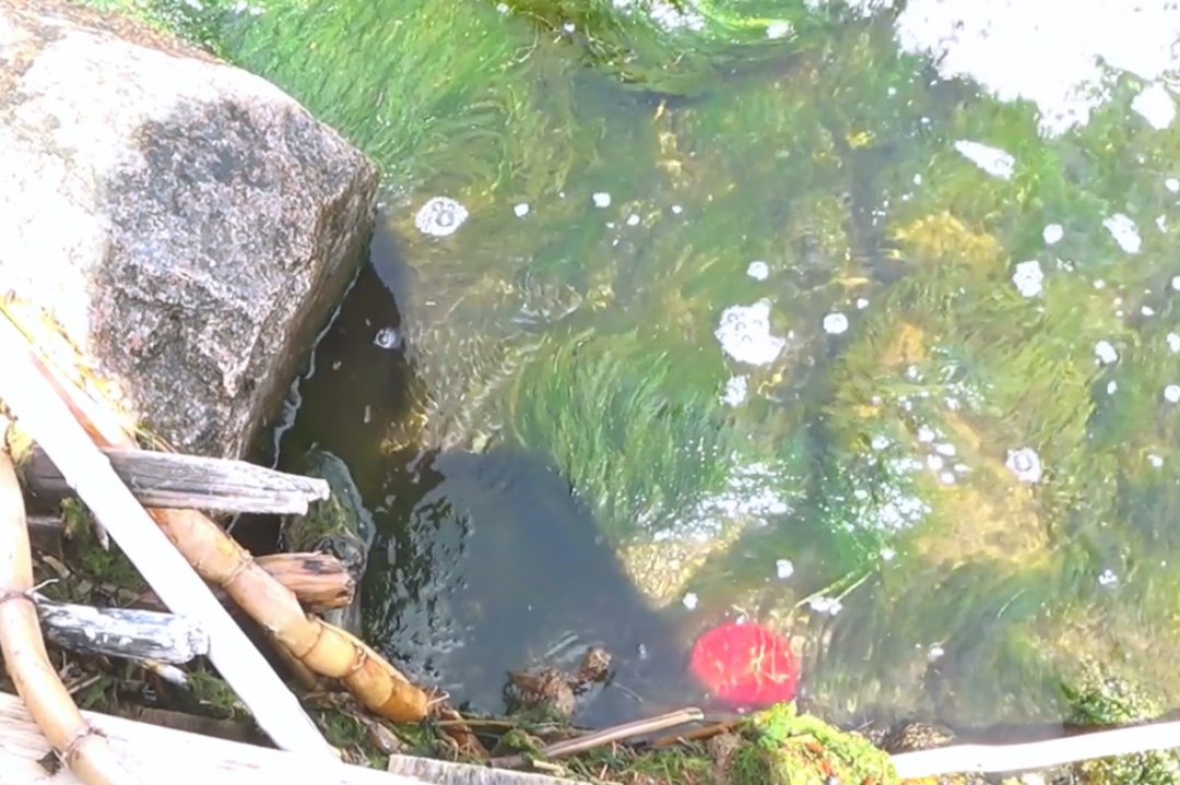 Активист показал, что вода на Собачьем пляже желтоватого цвета – ветер снова подогнал в Одессу воду из Днепра. В прибрежной линии за волнорезом затонула немалая часть растительных остатков — то, что не выбросило на берег.
