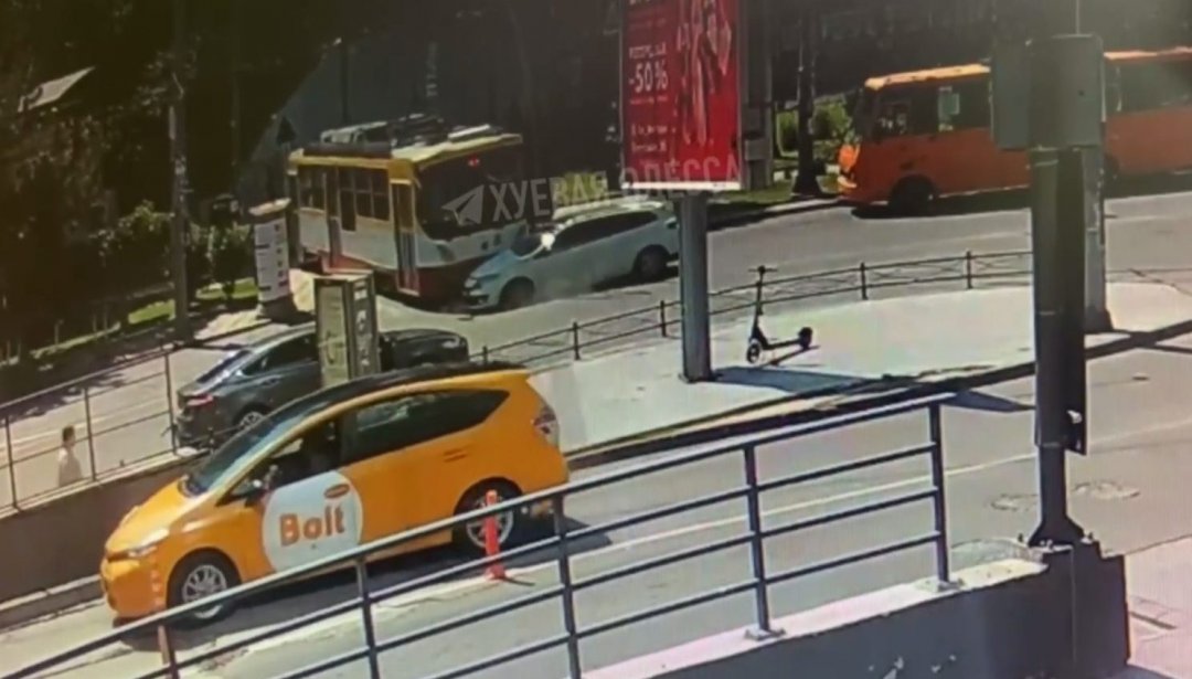 Трамвай №5 выезжал с разворотного кольца на конечной остановке в Аркадии, когда перед ним возникла легковушка – вероятно водитель решил что успеет проехать или не заметил общественный транспорт.