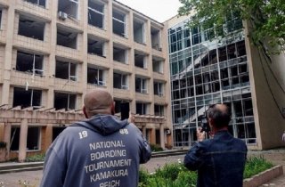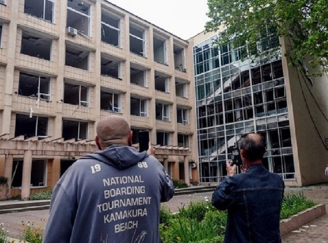 Здания университета пострадали от взрывной волны, вызванной падением обломков ракет на здание торгового центра, через дорогу от университета.