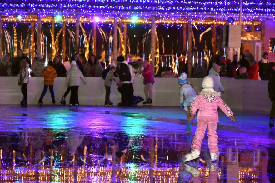 Вокруг нового катка установили праздничную иллюминацию. Кроме того, на этой локации есть кафе под куполом, где можно согреться и выпить чай или кофе. Также деревья у дворца спорта украсили гирляндами.