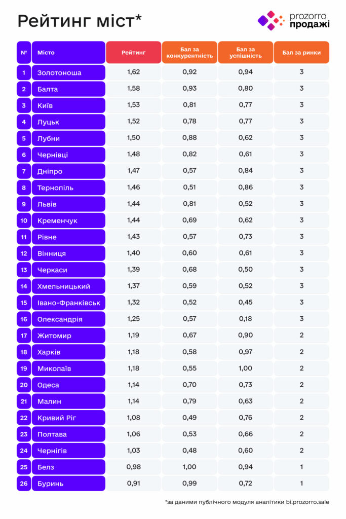 В 2023 году в рейтинге приняли участие 26 городов, активно реализуя свои коммунальные активы через Prozorro.Продажи.